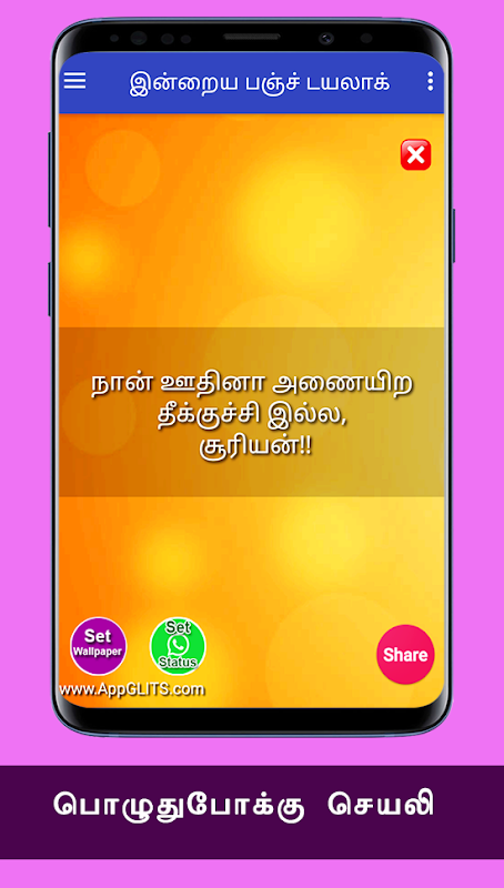 உள்ளோம் பஞ்ச் டயலாக்குகளை மையப்படுத்தியே இந்த ஆன்ட்ராய்டு செயலியை உருவாக்கி உள்ளோம். மகிழலாம் செயலி வழியாக நீங்கள் பல்வேறு பஞ்ச் டயலாக்குகளை பார்த்து மகிழலாம். நண்பர்களே !! நேரத்தில் செயலியின் மூலம் உங்களுக்கு விருப்பமான நேரத்தில், பஞ்ச் டயலாக்குகளை மொபைல் போனில் நோட்டிபிகேஷனாக பெறலாம். என்னவென்றால் ஒரு நல்ல விஷயம் என்னவென்றால், வாட்சப், பேஸ்புக், டிவிட்டர், ஈமெயில் வழியாவும் உங்கள் நண்பர்களுக்கு ஷேர் பண்ணலாம்.