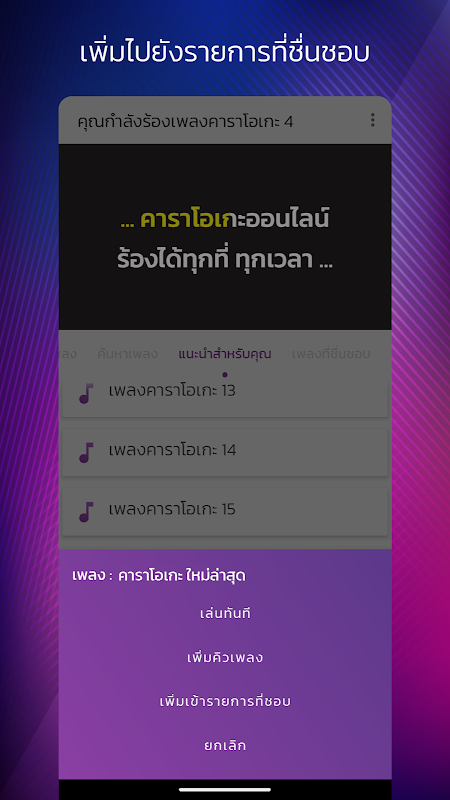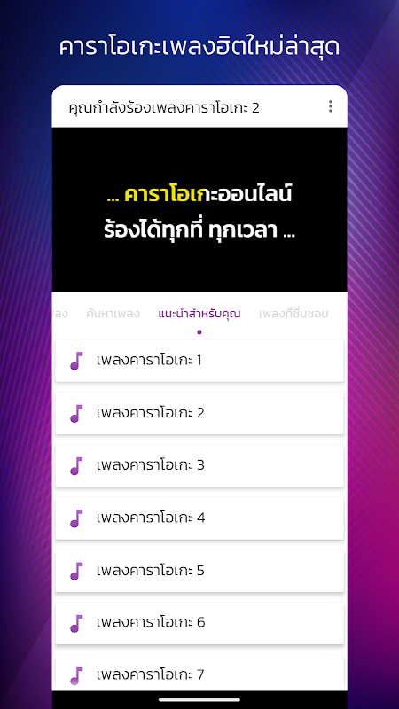 🎶 Караоке онлайн Пойте под караоке на мобильном телефоне, развлекайтесь с помощью караоке онлайн, приложения для пения, которое вы не должны пропустить. петь ли тайские песни Караоке тайских песен разных жанров, например, караоке кантри-песен струнная музыка караоке Караоке песня на всю жизнь Есть из чего выбрать. Вы также можете петь караоке, записывать видео, караоке, записывать звук, караоке тайской песни, записывать и петь вместе с музыкой, караоке, развлечения, которые готовы для вас, чтобы стать вокальным певцом в любом месте. легко на свой мобильный