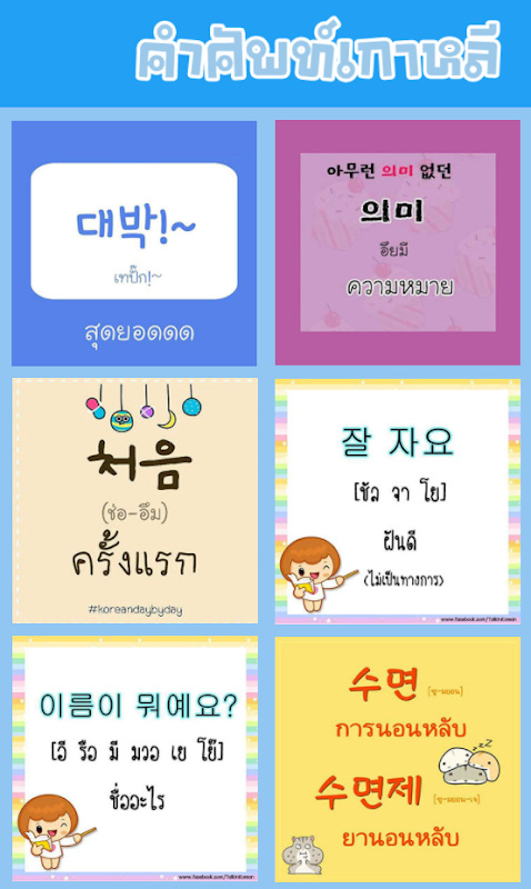 Приложения Приложение Korean слова для тех, кто хочет узнать корейский. Термин часто используется и требуется более 200 слов с словарными словами и корейскими переводами из Таиланда. Основной словарь Корея Может быть обучено, чтобы преуспеть и может быть применено в повседневной жизни. Вводные слова Кореи в любое время. Нет подключения к Интернету имеется.