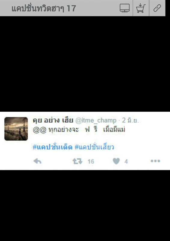 แอพพลิเคชั่นรวบรวมแคปชั่นทวิตฮาๆ แคปชั่นเด็ด แคปชั่นโดนๆ รวบรวมเอามาไว้ให้ทุกท่านได้นำไปโพสต์กันใน Facebook, Line, Twitter แคปชั่นประโยคไหนที่โดนใจ ก็ลองเอาไปโพสต์กันดูนะ รับรองกดไลค์กระจาย ไม่ว่าจะเป็นแคปชั่นโดนๆ แคปชั่นฮาๆ แคปชั่นเด็ดๆ แคปชั่นทวิตเตอร์ฮาๆ แคปชั่้นกวนๆ แคปชั่นทะลึ่งๆ แคปชั่น IG รวมแคปชั่นทวิตเด็ดๆ บาดจิตบาดใจแน่นอน แคปชั่นเหล่านี้ผ่านการคัดกรองมาอย่างดีจากทีมผู้พัฒนา อ่านแล้วโดน อ่านแล้วขำกลิ้่ง อ่านแล้วจี๊ดใจ หลากหลายอารมณ์ สามารถเซ็ตเป็นวอลเปเปอร์, เซฟเก็บไว้ในเครื่อง หรือแชร์ให้เพื่อนๆ ดูได้ โดยจะมีการอัพเดตแคปชั่นทวิตฮาๆ แคปชั่นเด็ดๆ โดนใจเพิ่มขึ้นเรื่อยๆ