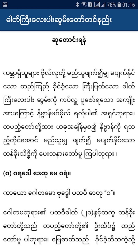 Это мобильное приложение версии 1.0 будет работать лучше на телефонах с Myanmar Unicode Font. В следующих версиях будет включен шрифт Zawgyi.