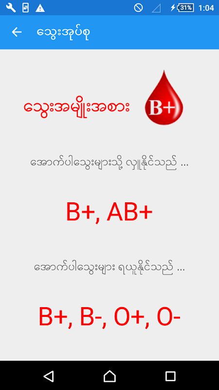 Переливание крови должно быть выполнено в старой классификации типов крови, Вместо крови, вызванные неправильной кровью / DO и боятся симптомов စသည်များကို создать это приложение легко узнать.