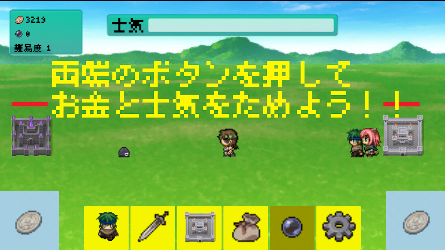 両端のボタンをタップしてお金をためて味方のレベルを上げて敵を倒し城を落とそう!!
