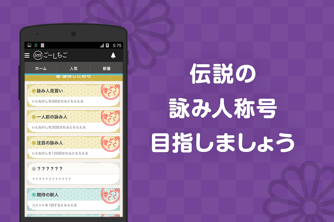 575の投稿数や、もらったいとおかしの数に応じて、称号がもらえます。たくさん称号を集めましょう!
