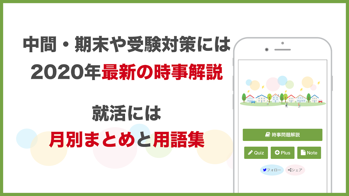 短時間で最新の時事問題や用語が勉強できる無料のアプリです。入試や就活、テストの予想問題を随時更新しています。2019年時事用語チェックリストを無料配布中です