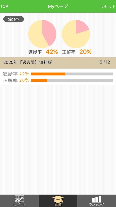 「レポート」であなたの学習時間を確認できます。「成績」で全体およびカテゴリごとの問題の進捗率、正答率を確認できます。「ランキング」で学習時間、成績を元にしたポイント・ランキングを確認できます。ランキングは、ランクと今週の2種類があります。