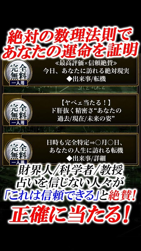 無料鑑定は5メニュー。あなたという人間を数学的なアプローチで証明していきましょう。数はあなたという人間を客観的な根拠と、具体性で証明してくれます。数という原理ももともとは人間が生み出した根拠です。その絶対根拠を用いる事により数学的に証明していきます。