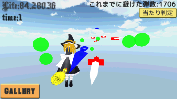 魔理沙を動かして弾を避ける、3Dアクションゲームです。制限時間の間、向かってくる弾から逃げ切ればステージクリアです。