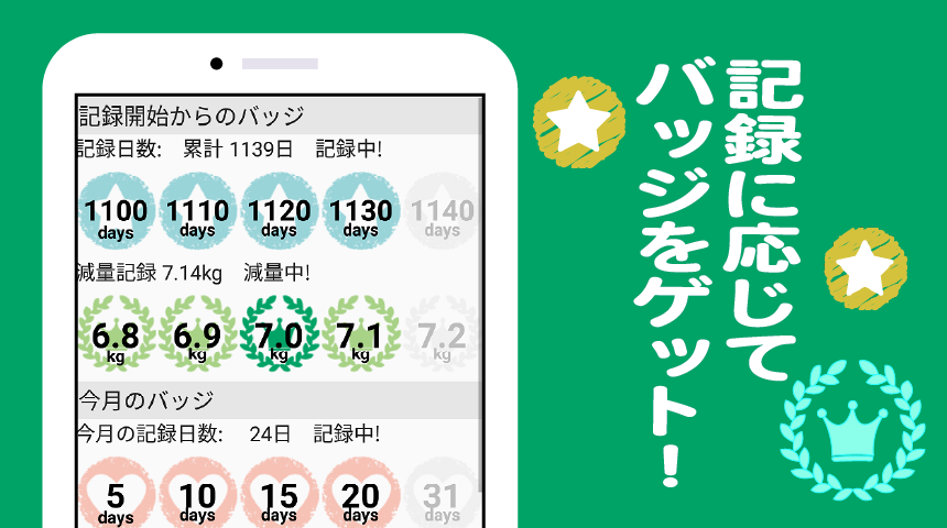 - Получайте значки в зависимости от количества дней, в течение которых вы записываете вес, и от сброшенного веса!