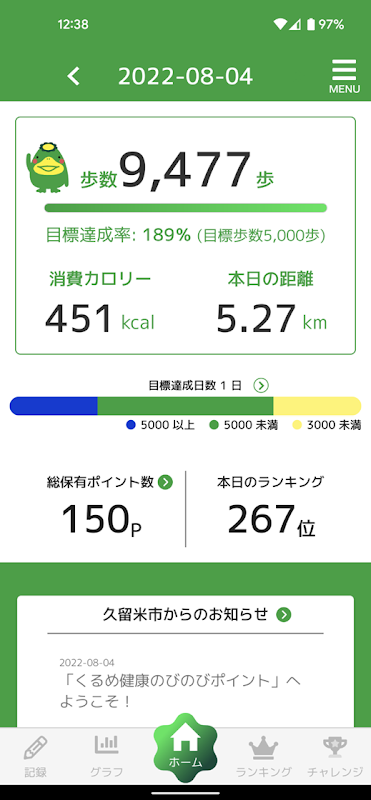 Приложение «Kurume Health Nobinobi Points» — это приложение для поддержки здоровья в городе Куруме, которое начисляет баллы за ежедневные занятия спортом (например, ходьбу и медицинские осмотры).