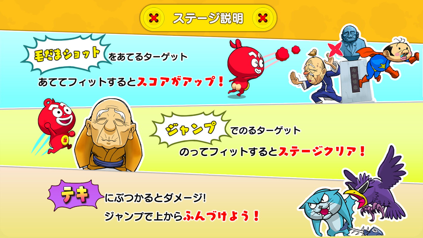 -毛のばし:ステージ途中に木やポールなどの毛でつかめるターゲットが出現。タイミングを合わせて毛伸ばしすれば、大ジャンプなどの爽快アクションが可能に!