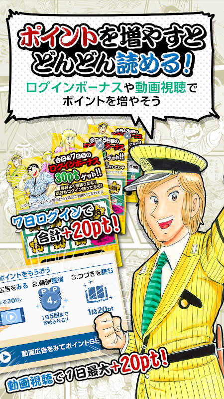 『こちら葛飾区亀有公園前派出所』のマンガを、アプリ内で獲得できるポイントを利用することで毎日1話読むことができます。