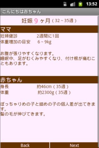 妊婦さん、またはそのパートナー向けのアプリです。現在の妊娠週数をウィジェットで確認できます。各月齢ごとのお母さんの情報や赤ちゃんの情報を表示できます。
