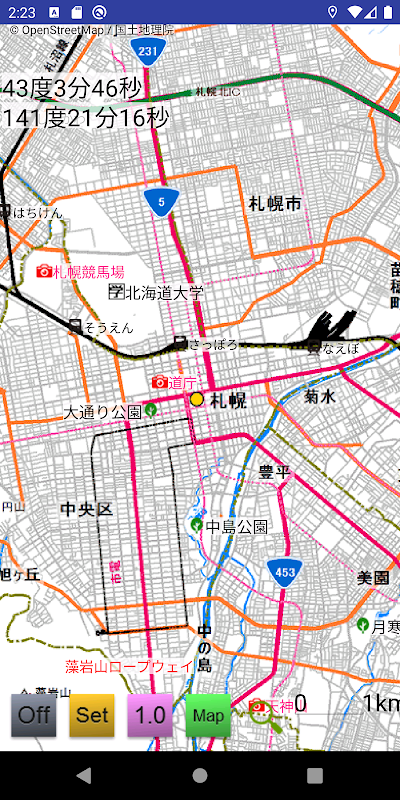 札幌市周辺のオリジナル地図です。国土地理院の国土基本情報20万(ベクトル)がベースで、それにOpenStreetMapと独自情報を付加した地図になっています。地図は札幌エリアを用意しており、それ以外の北海道エリアは簡易地図の表示になります。