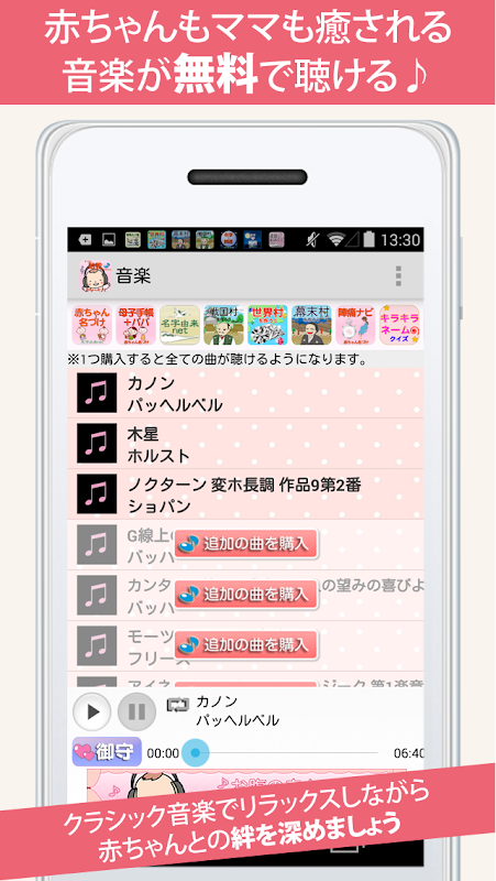 ・Даже те, кто уже рожал, могут использовать это приложение в качестве музыкального проигрывателя, поэтому, пожалуйста, слушайте его вместе с вашим ребенком.