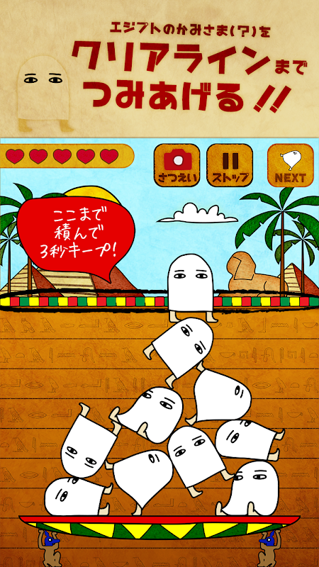 画面上部に現れるいろんなポーズの「メジェドさん」を、クリアラインまで積みあげよう。