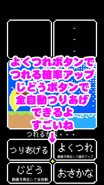 「よくつれ」ボタンで広告を視聴すると、3分間生き物が釣れる確率アップ。