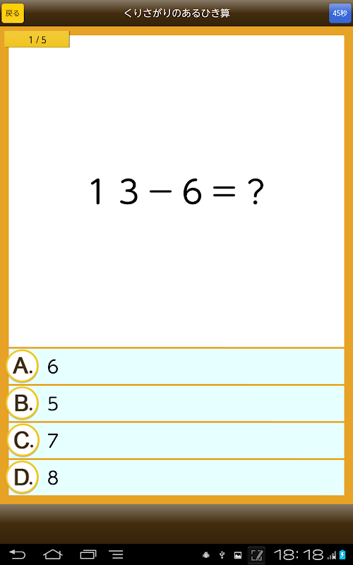 片手の指を使って確認できる5までの引き算から始まり、繰り下がりの練習、20までの引き算、と小学1年生の算数で学習する引き算を少しずつステップアップしながら習得できるメニュー構成になっています。