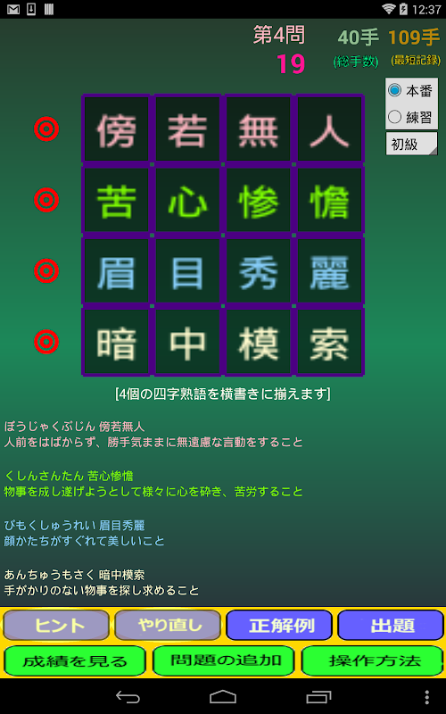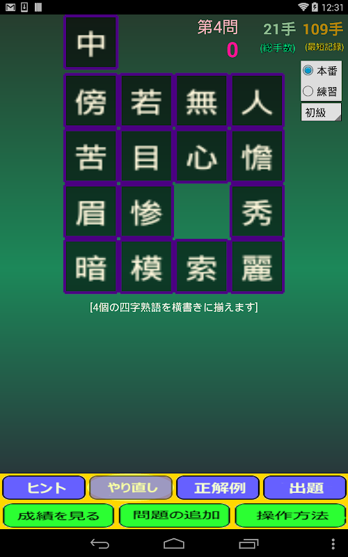 このゲームは、バラバラに並んだ漢字を、15パズルのやり方で4個の四字熟語に並べ替えて、その最短手数を目指すゲームです。