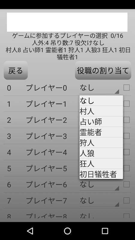 В ролях можно свободно устанавливать, если человек Tonomura с 4 или более человек. Вы можете играть в гипсе, что он хочет играть. Выберите название деревенских жителей, гадалку, психическую, охотник, Sharer, Nekomata, оборотни, псих, фанатик, ину, 11 видов безнравственного человека.