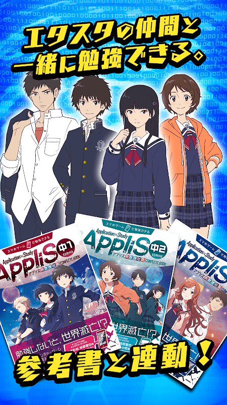 中学3年分の英数理社国を学べる勉強ゲームが登場! 勉強することでストーリーが開放される学園SF物語 対応書籍と一緒に勉強することでより効率的な学習ができる!