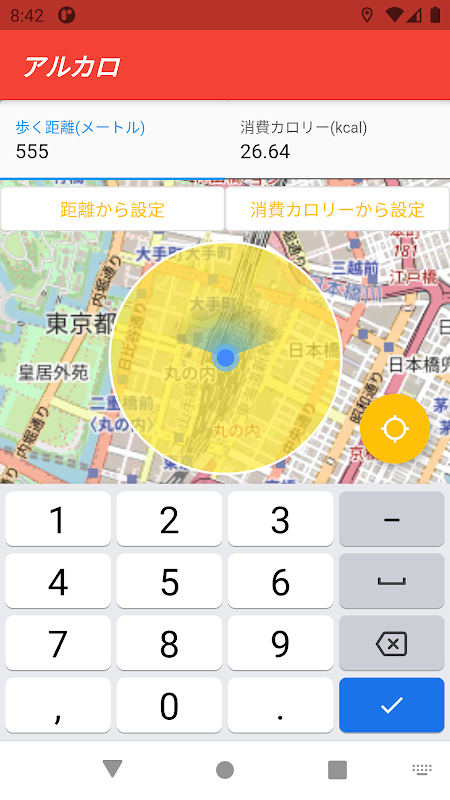 消費カロリーを入力すると、そのカロリーを消費するために現在地からどこまで歩けばよいのかを地図上に表示します。