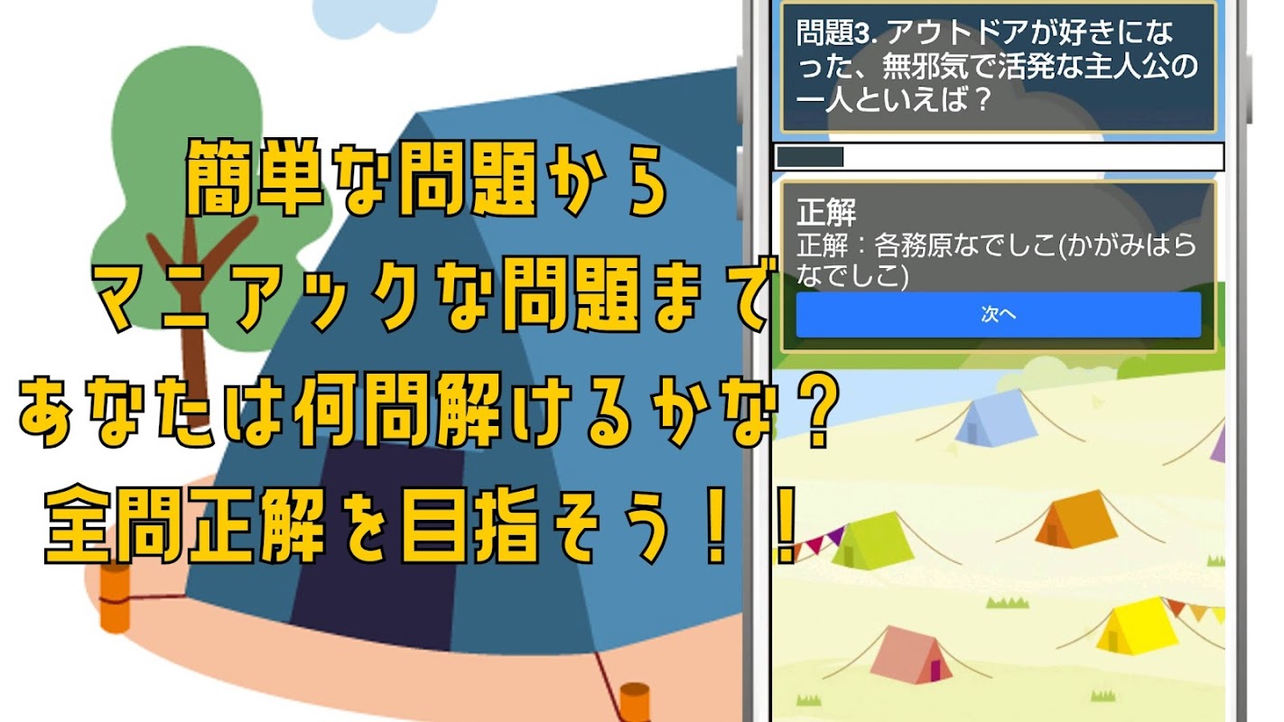Доступно приложение-викторина по популярному аниме "Yurucamp". У нас есть широкий спектр задач из манги, аниме и т.д. Есть мир «Юрукамп», который вы еще не знаете.