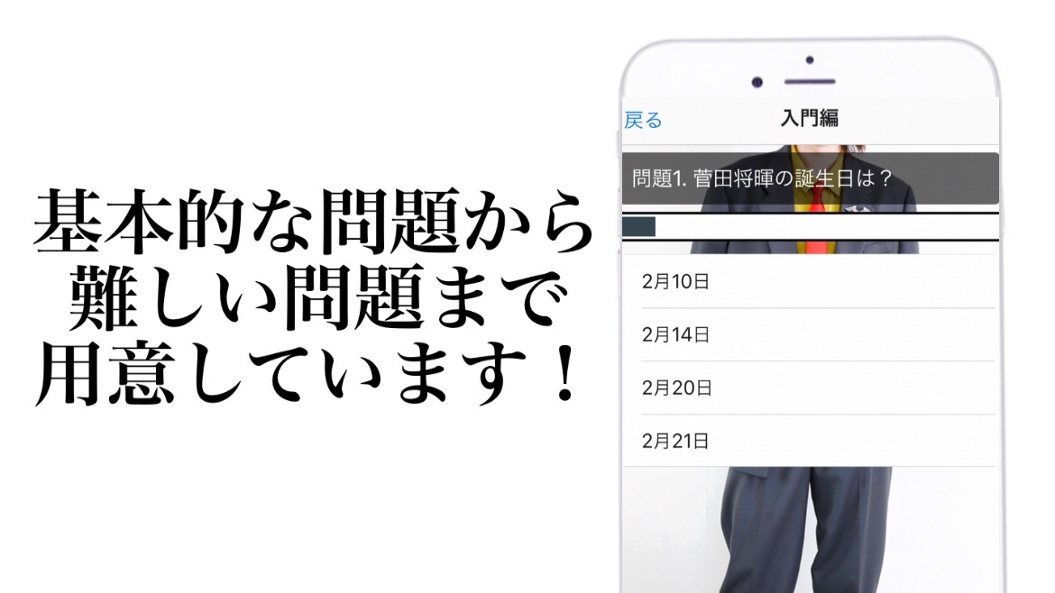 クイズ内容は菅田将暉さんの基本情報やテレビ出演、楽曲などの中から問題を出題し、クイズ形式にしたアプリです。