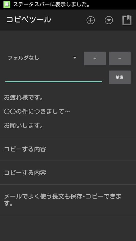 よく使う単語や文章(長文可)などを事前に登録しておき、必要な時にクリップボードにコピーすることで最小限の入力で済ませることができるアプリです。