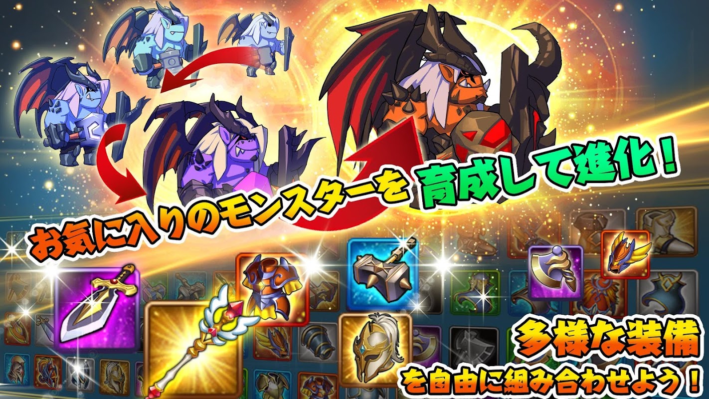 バトル前半のパズルパートで、タテ・ヨコ・ナナメに同じ絵柄を3つ以上そろえてパネルを消すと、その絵柄のモンスターを戦場に召喚&進化!