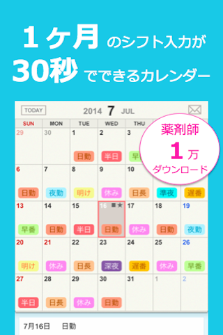 Приложение для управления расписанием и календаря рабочего графика для фармацевтов, работающих посменно. ★ Регистрация смены на месяц выполняется всего за 30 секунд istered Зарегистрированные смены можно легко отправить друзьям по телефону или электронной почте!