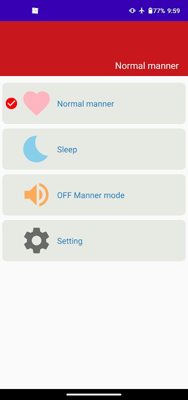Простой режим со значительно обновленной версией. Это приложение для переключения режимов, которое позволяет легко переключаться между режимом манеры, режимом спокойной ночи, режимом манеры ВЫКЛ и громкостью мелодии звонка.