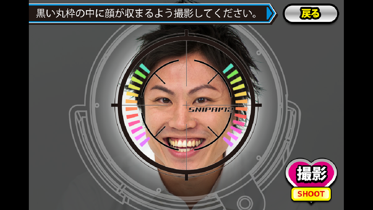 ・撮影画面の中央には、スコープが表示されます。スコープの丸い黒枠のなかに、顔が収まるように撮影します。撮影後、顔の位置を調整する画面へ移動します。
