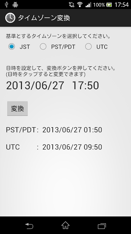 変換元のタイムゾーンをチェック後、変換したい時間を設定して変換ボタンを押下すると変換後の時間が表示されます。