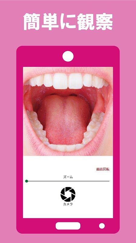 Это приложение камеры, которое наблюдает и записывает ваш рот. Перевернув смартфон вверх дном, вы сможете решать трудные наблюдения во рту! Не забывайте проводить ежедневные наблюдения, чтобы предотвратить кариес и заболевания пародонта.