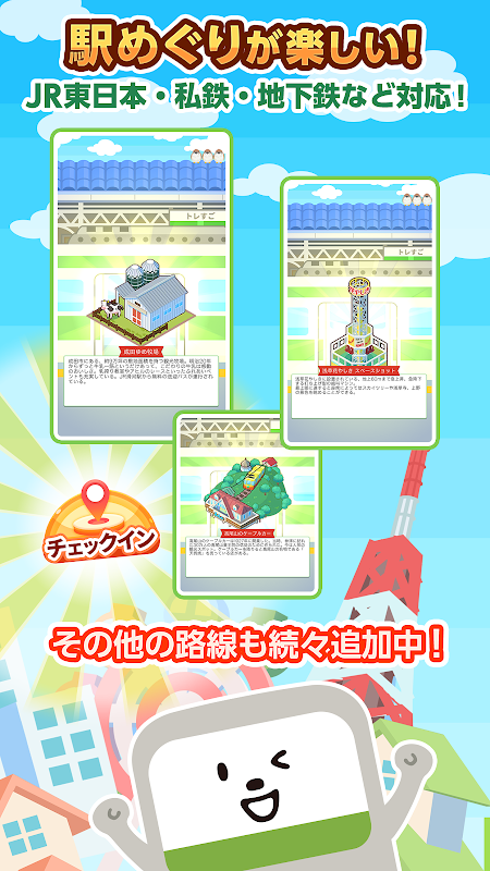 Железная дорога x городское планирование x локационная игра. Частные железнодорожные станции, кроме JR East, также поддерживают более 2500 станций! Это игра с информацией о местоположении и городским планированием с концепцией «сделать повседневное движение более увлекательным!»