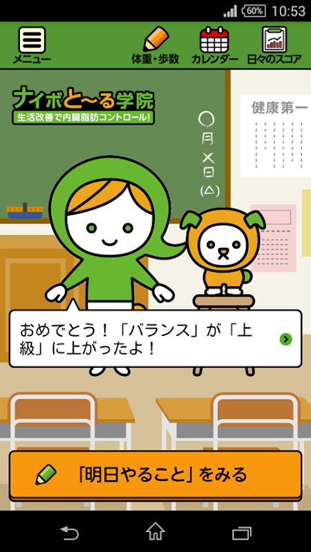 『ナイボと~る学院』は、学院の案内役「ナイ坊」と一緒に内臓脂肪をためない生活習慣を身につけることを目的とした会員専用のアプリです。