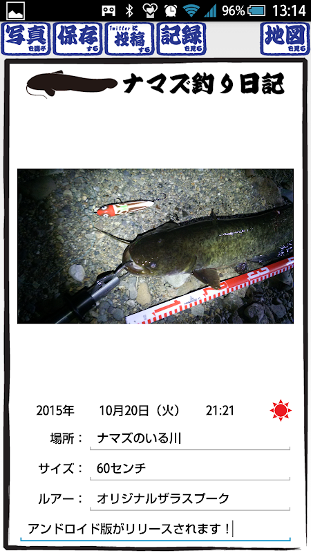 いつどこで何のルアーでナマズを釣ったのか記録できます。