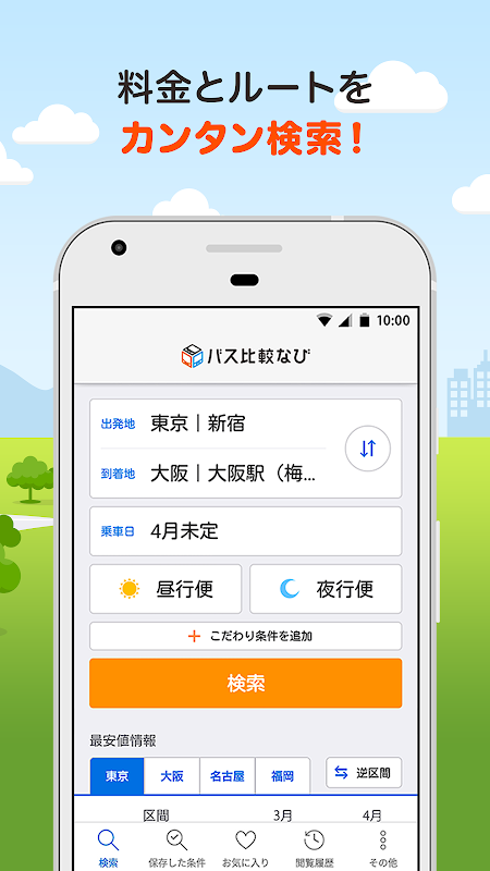 よく使うルートの発着地や設備ほか、お好みの条件を保存できるので、検索のたびに設定する手間が省け、帰省やビジネスユースにも便利です