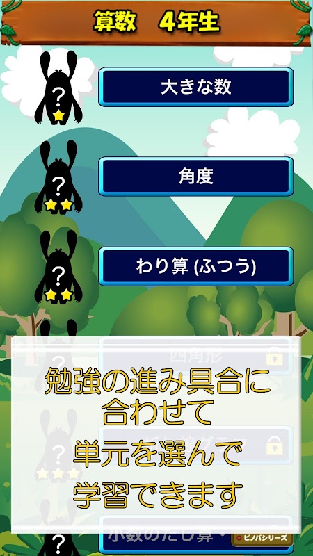 小学校4年生の算数アプリの決定版!学習の進み具合に合わせて単元を選択して、効率的に復習できます。4択のクイズ形式という使いやすさ、勉強のご褒美にモンスターを集めていく楽しさで、子供が継続的に勉強します。