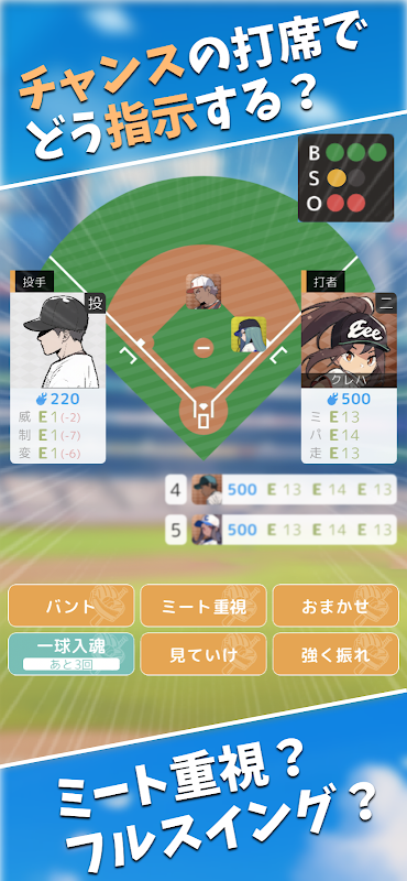 Игроки могут быть организованы свободно. Помимо питчера, есть различные защитные позиции, и вам придется оценить способности каждого игрока и принять меры для каждого игрока. Укрепляйте своих игроков и делайте их сильнейшими благодаря постоянному повышению уровня и мастерству!