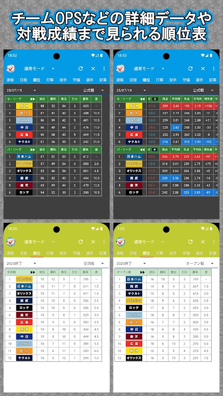 ・Отображает турнирную таблицу Центральной и Тихоокеанской лиг.