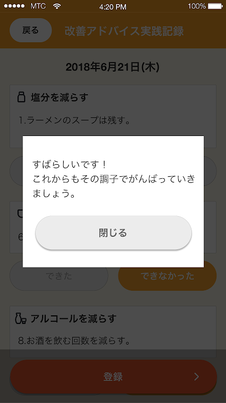 Давайте попрактикуемся в совете, указанном в шаге ②. Одна из функций Yusapo, «Практическая запись рекомендаций по улучшению», позволяет вам записывать, достигли ли вы каждой цели и приняли ли вы предписанное лекарство. Когда вы сделаете запись, вы получите комментарии от Юсапо в зависимости от того, как вы достигли своих целей.