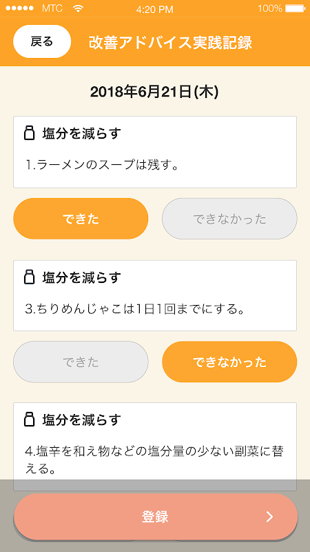 На основании содержимого, записанного на шаге ①, мы дадим рекомендации по улучшению питания. Совет делится на три типа: соль, кофеин и алкоголь.В соответствии с вашими привычками в еде, такими как «уменьшить количество раз, когда вы едите соленые огурцы», «избегайте чашки кофе» и «установите день отдыха один раз в день». неделя." Будет предложено несколько советов, из которых вы сможете установить до 5 целей. (Чем больше соли вы потребляете, тем больше у вас советов.)