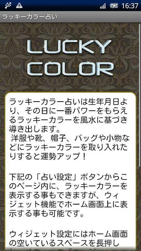 Из "гадания настройки" кнопку в приложении, вы можете также отобразить повезло цвет, но это также возможно, чтобы отобразить "счастливый цвет гадания" на главном экране на функцию виджета.