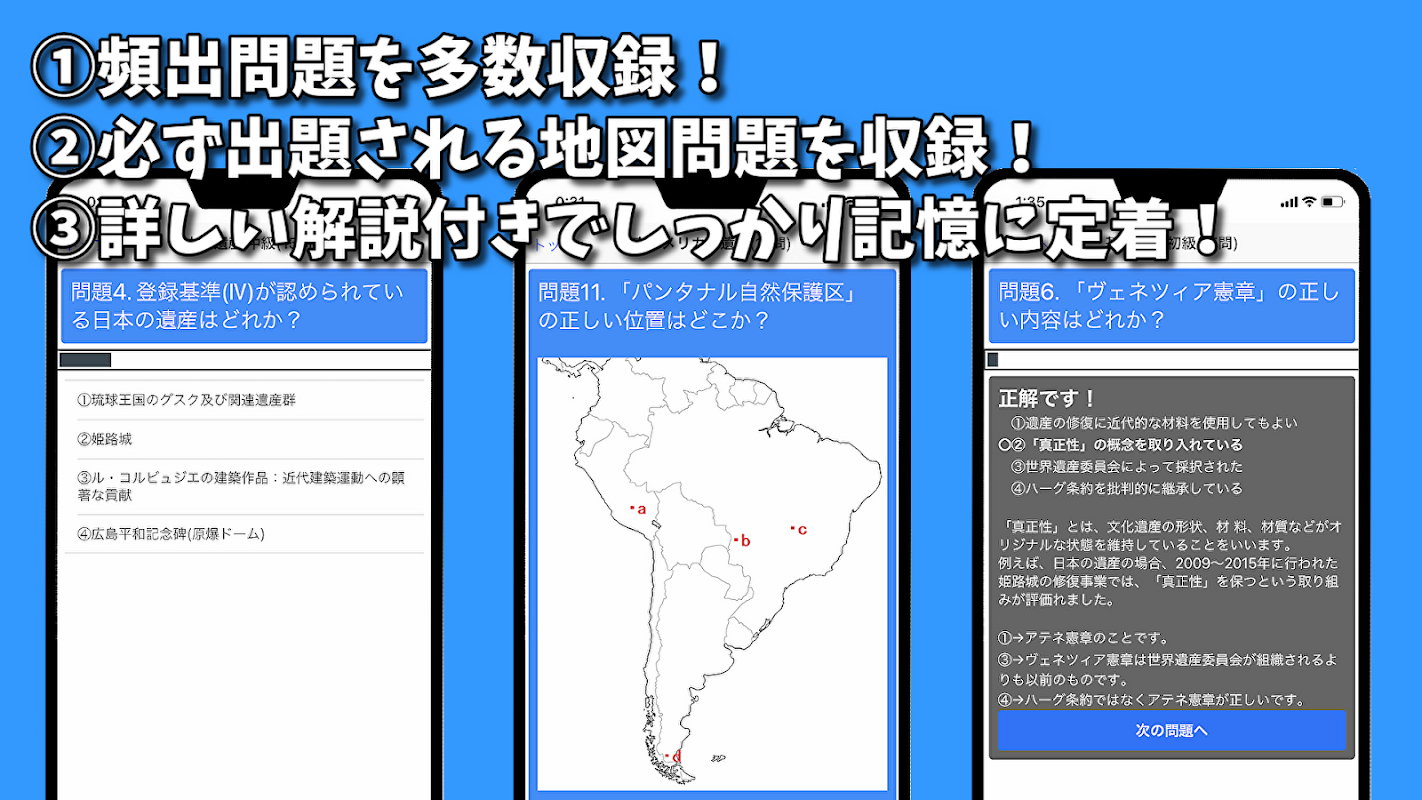 本アプリでは、基礎知識・日本の遺産の問題は多めにして、問題内容も簡単なものから難しいものまで用意してあります。