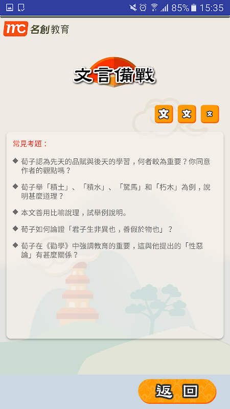 文言備戰app專為應考中學文憑試卷一而設,方便考生隨時隨地隨手鎖定要點,即時温習,以最短時間掌握文言篇章或各相關朝代的關鍵重點,長線部署或即時備戰兩相皆宜。