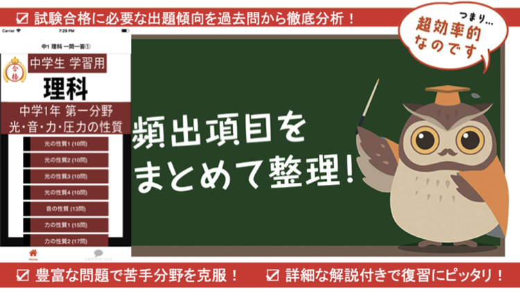 このアプリでは分野別に中学1年生が学ぶ理科の問題を85問用意しました。
