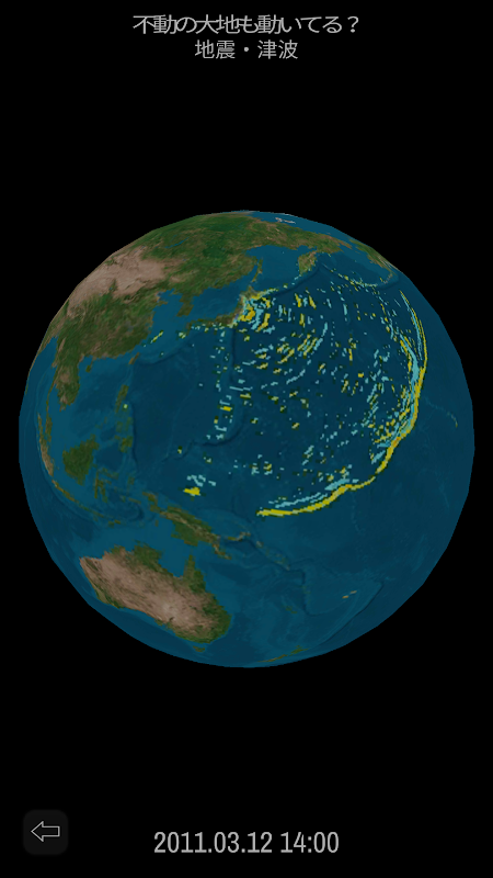 その展示内容のプレビューとして、配布リーフレットから「飛び出す絵本」のように生きた地球のさまざまな姿を見られるようにしたのが、このARプログラムです。(地球をめぐるCO2、地球温暖化の未来、津波、生物の地球移動など)