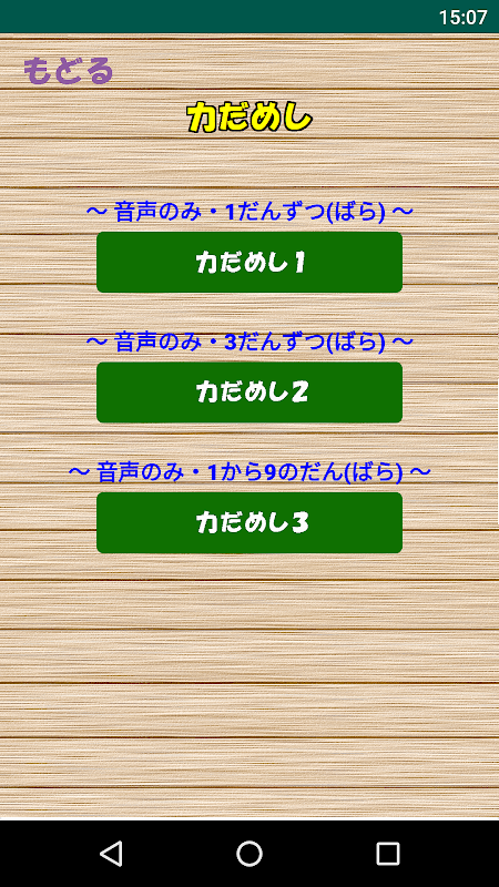 「力だめし1」では1段づつ、「力だめし2」では3段づつ、「力だめし3」では1から9の段の中からランダム出題(10問・15問・20問)されます。
